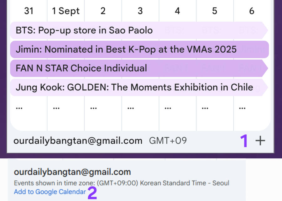 The calendar shows future events but serves also as an archive with sources linked to past event.Divided in different topics, so they can be visible in different colours as follows:- Main calendar containing main events, releases and anything that does not fit in the other categories.- Anniversaries calendar containing birthdays, songs/ album releases.- Tour calendar containing upcoming concerts.- TV appearances & (music) shows containing TV show appearances, documentaries, variety shows.- Exhibitions & Pop-up Stores- Voting & Awards- Unannounced Events containing spontaneous content drops or Weverse lives.The calendar is in KST.